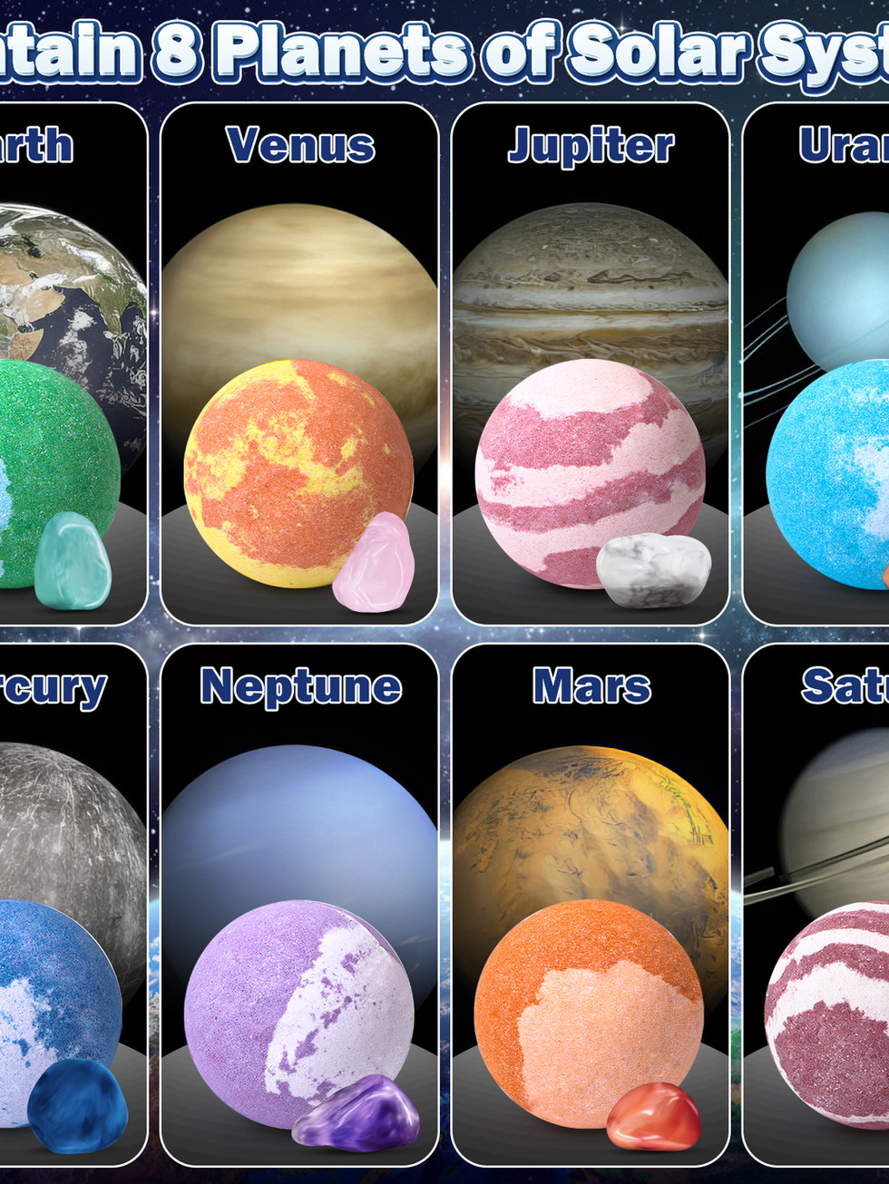 - Bath Bombs with Surprise Inside - Comes with 8 different colored ball-shaped planet bath bombs with 8 gemstones inside, 4 necklace ropes, 2 jewelry fastenings and 8 gem information cards. Kids can collect all 8 planets in this solar system toys kit, including Mercury, Venus, Earth, Mars, Jupiter, Saturn, Uranus, and Neptune. Manufacturer recommended age: 3 years and up