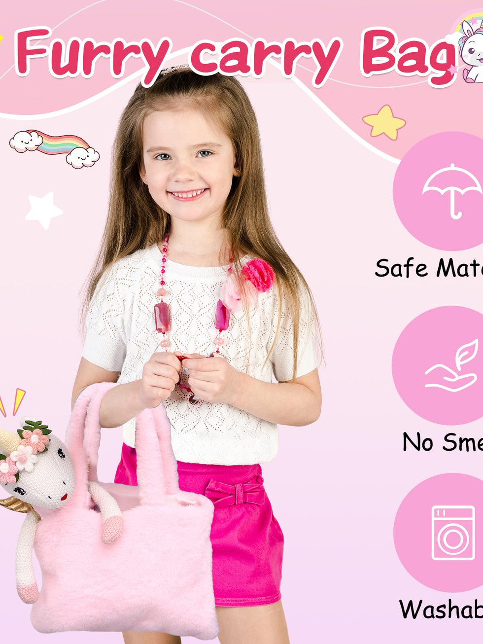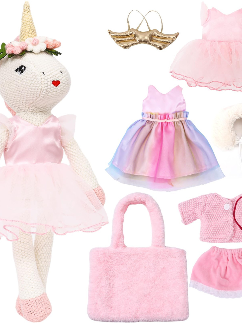 - 10 PCS STUFFED ANIMALS FOR GIRLS: With a soft white unicorn doll measuring 19 inches,it comes with 1 colored dress,1 pink dress,1 wings,1 furry shawl,1 sweater cardigan,1 pink skirt and an extra large pink furry carry bag.Perfect for girls toys age 4-5,5-6 years old